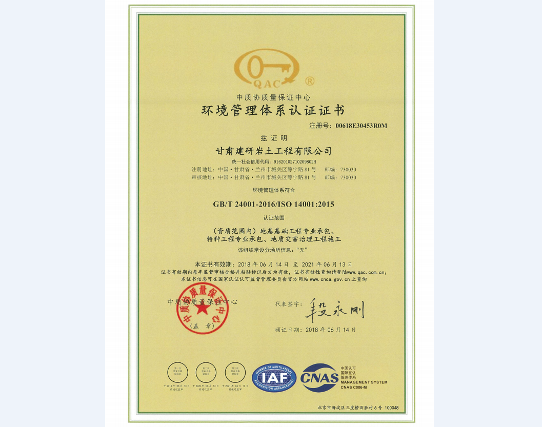 甘肃建研岩土工程有限公司《环境管理体系认证证书》