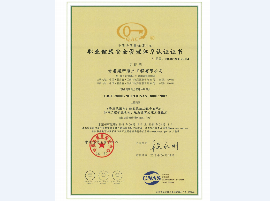 甘肃建研岩土工程有限公司《职业健康安全管理体系认证证书》