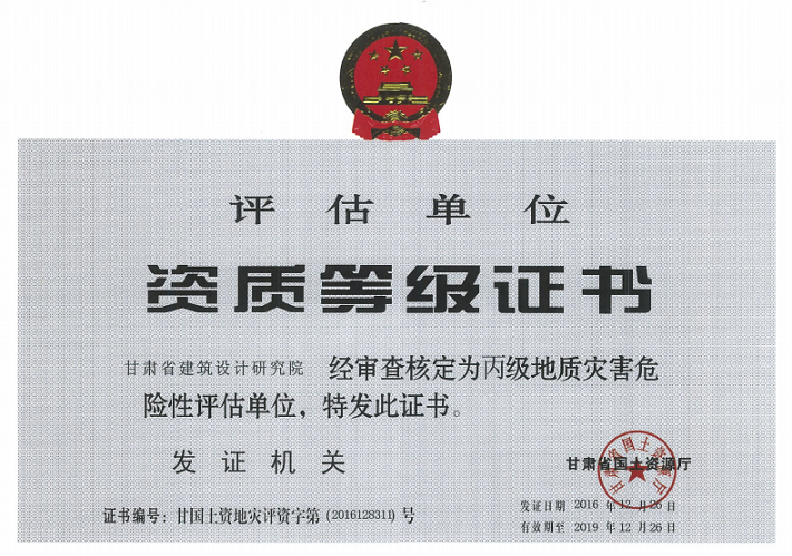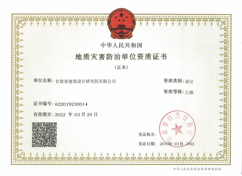 甘肃省建筑设计研究院有限公司《地质灾害防治单位资质乙级证书》